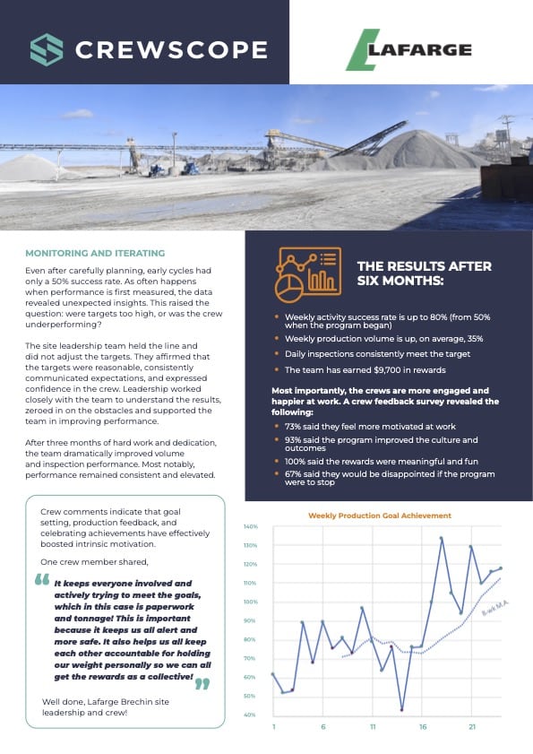 When an employee survey revealed a gap in engagement levels between site and office workers, Lafarge recognized the potential impact on safety and productivity. Lafarge site leaders were empowered to identify and implement innovative solutions to improve site team engagement. The Lafarge Brechin team partnered with Crewscope to help tackle the problem.